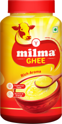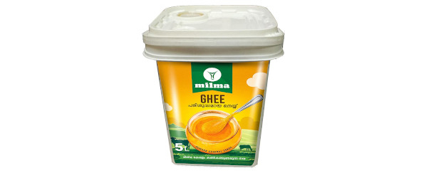 Contains 99.7 percent milk fat. Manufactured by melting fresh cream under hygienic conditions. Milma ghee has the ideal golden yellow colour due to presence of natural carotene in cow milk. (In contrast, ghee manufactured from buffalo milk is white in color). No artificial colours or flavours are added in Milma ghee. Natural aroma and flavour of ghee is retained since ghee is produced directly from fresh cream instead of going in for melting stored butter